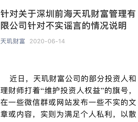 对此,天玑财富回应:的确出现回款困难和兑付危机,但承诺不会跑路,希望给一定的私人空间。