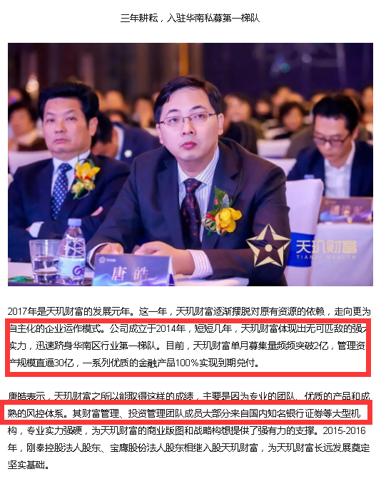 天玑财富成立于2014年。2018年1月,天玑财富公号自称,“短短几年,天玑财富体现出无可匹敌的强大实力,迅速跻身华南区行业第一梯队。目前,天玑财富单月募集量频频突破2亿,管理资产规模直逼30亿,一系列优质的金融产品100%实现到期兑付”。
